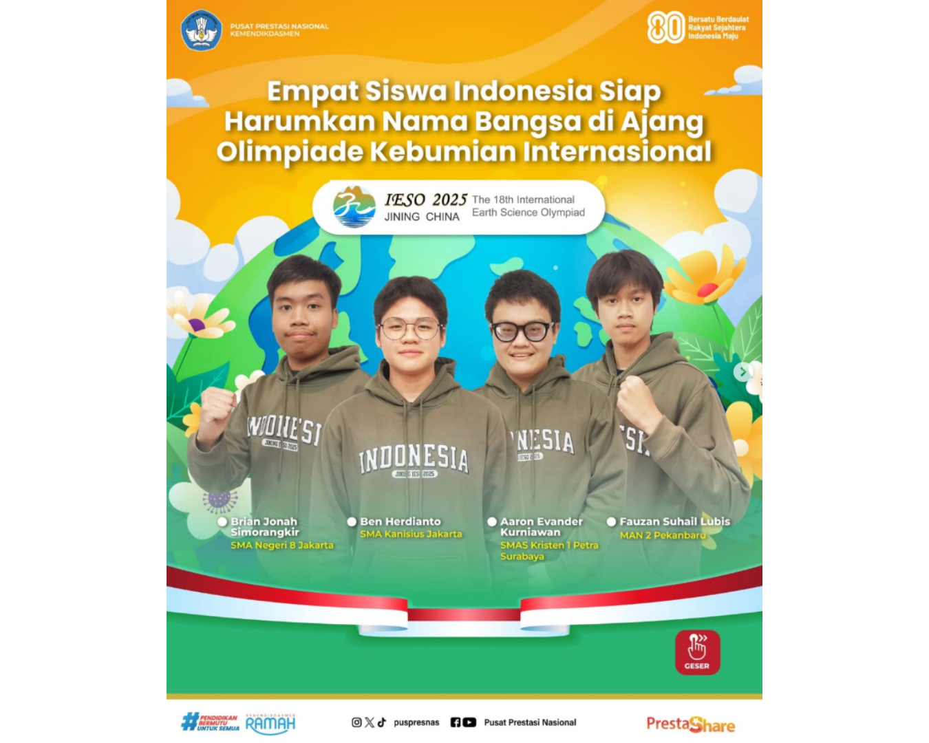Setelah perjuangan para pejuang muda di IOI, ada kelompok pelajar lagi yang siap untuk mengharumkan nama Indonesia di tingkat internasional. Para pelajar ini siap untuk berjuang di olimpiade kebumian tingkat internasional atau International Earth Science Olympiad (IESO) ke-18 yang akan diadakan di Ji’ning,China, tanggal 7 – 17 Agustus 2025.